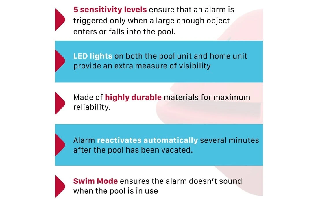 - Het produceert een krachtig, luid alarm op zowel de zwembadunit als op het home-systeem.